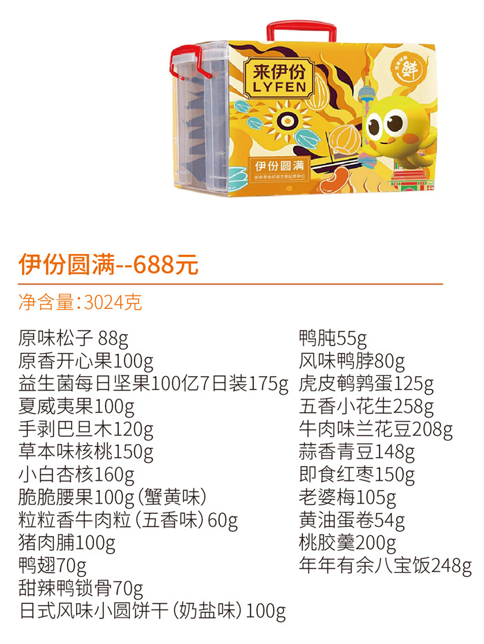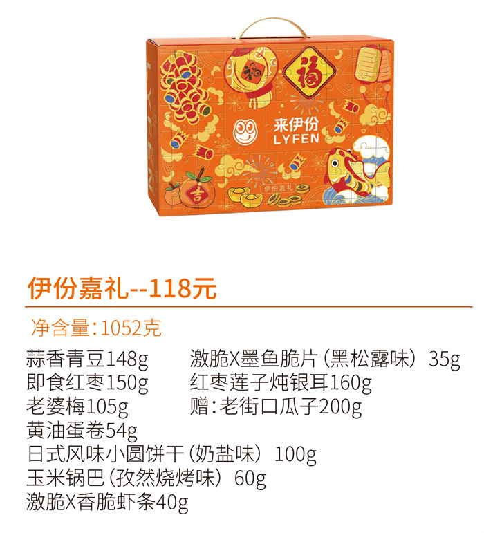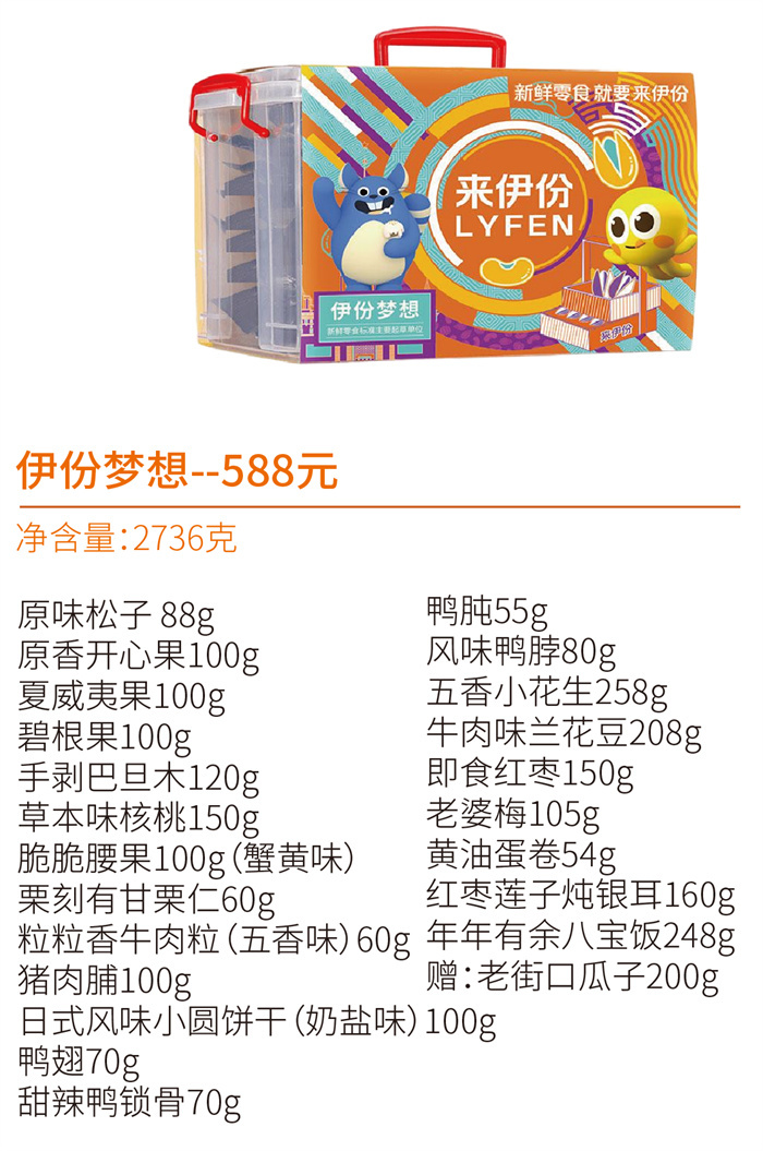 来伊份成立于1999年,公司主营业务为休闲食品经营,产品覆盖炒货、蜜饯、肉制品等九大系列,达到700多种。2013年销售额超过30亿,全国员工人数近1万名 。目前在上海、江苏、浙江等9个省、直辖市 已拥有连锁直营专卖店超过2500多家,并获得"上海市著名商标"、"上海名牌产品"、"2010上海世博会特许产品零售商"等多项荣誉。